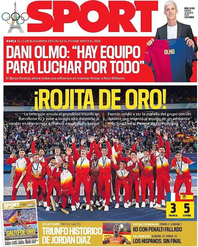 虽然女足留下了遗憾,但一天斩获两金的成绩还是让西班牙各大媒体大加赞颂,尤其是时隔32年再度摘得奥运男足金牌,这一天几乎所有西班牙报纸都在头版最显眼的位置放上男足夺冠的画面。《阿斯》报的文章评论道:“32年后的传承,这批小伙子们以史诗般的美妙表现,当之无愧地赢得了奥运冠军。这场胜利为西班牙过去一年来的非凡足球赛季画上了一个圆满句号。上一次夺得奥运男足金牌的欧洲球队也是西班牙,在1992年的巴塞罗那,如今西班牙亲自完成了这个轮回。“