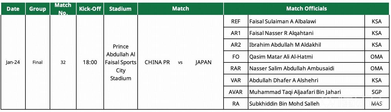 主裁判Faisal Al-Balawi来自东道主沙特;第一、第二助理裁判也都来自沙特;第四官员和预备助理裁判则均来自阿曼;还有一个视频裁判也来自沙特。换句话说,整个裁判组全部由西亚人把控。这对于苦西亚裁判久矣的中国男足来说,不是什么好消息。